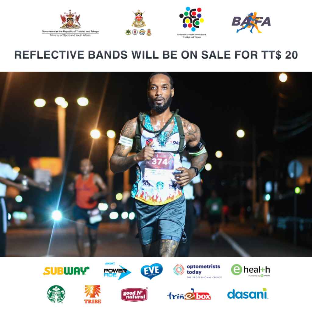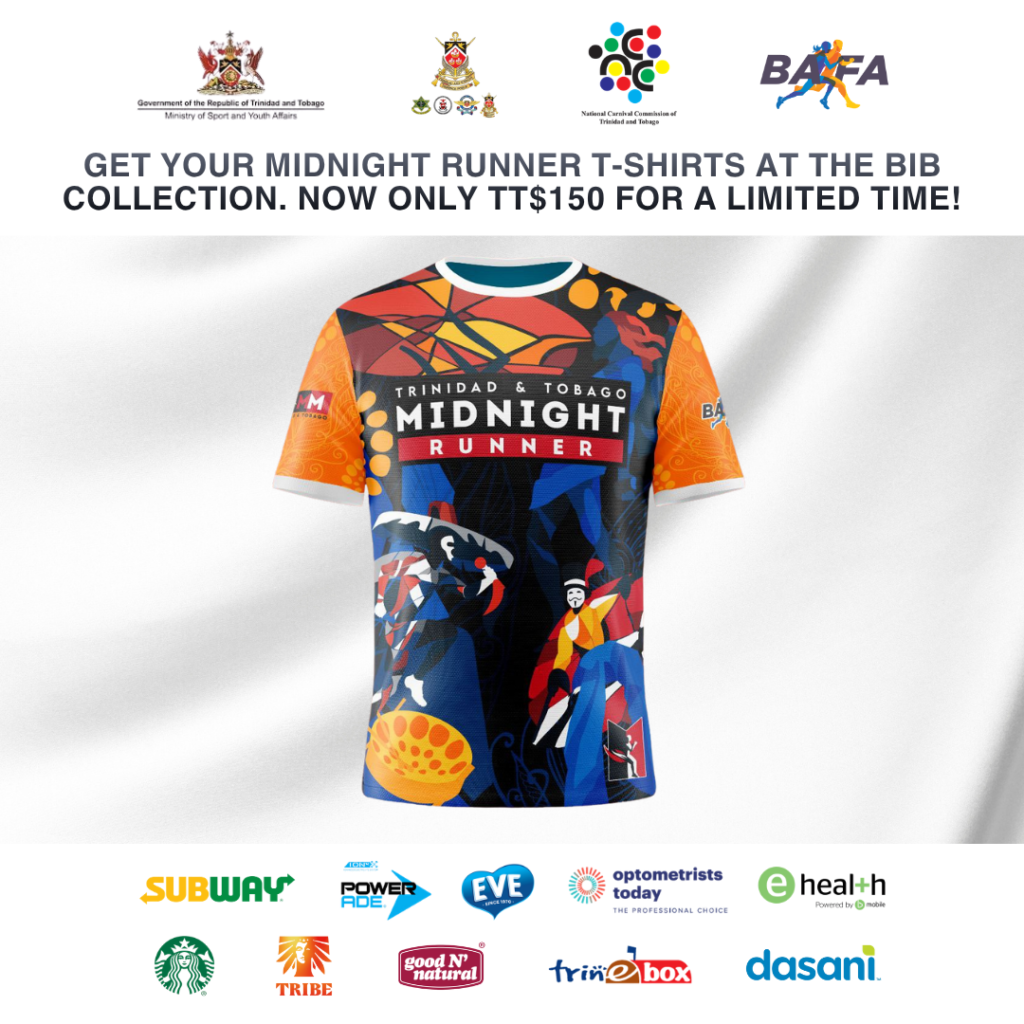 Midnight Runner T-shirts (on limited time offer for TT$150.00 while stocks last) and reflective bands for TT$20 will also be available for sale during the bib collection.