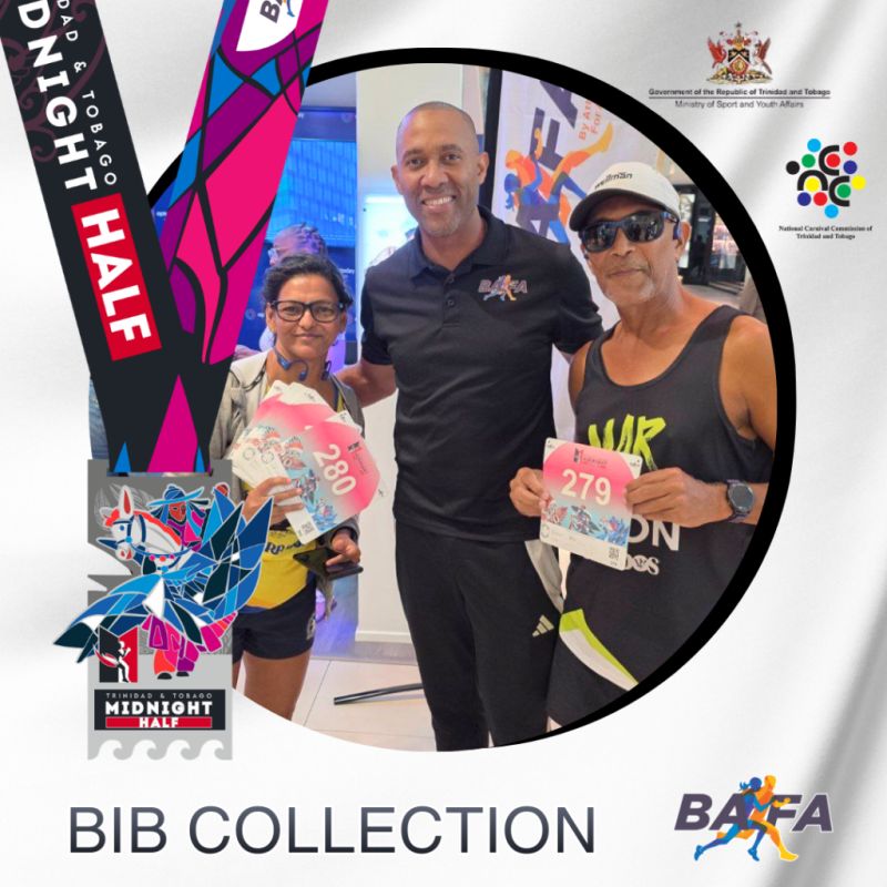 The Bib Collection for The Trinidad & Tobago Midnight Half Marathon 2026 Chaguaramas, and the sale of Midnight Runner T-shirts (TT$150.00) & reflective bands (TT$20.00) are on the following dates: