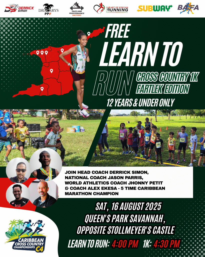 Join Head Coach Derrick Simon, World Athletics Coach Jhonny Petit, National Coach Jason Parris & Coach Alex Ekesa – 5 time Caribbean Marathon Champion – for a FREE “Learn to Run: Cross Country (XC) 1K Fartlek Edition” session for children 12 years & under only!