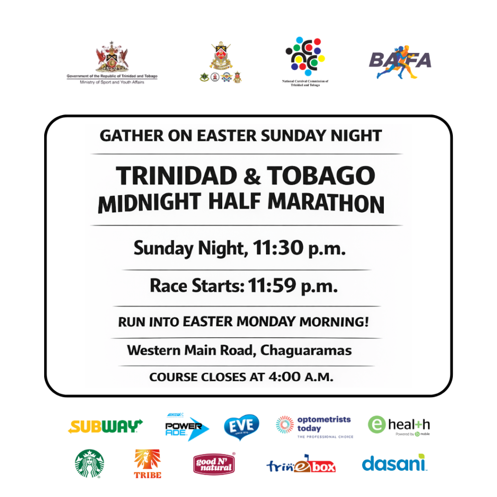 Reminder to gather on EASTER SUNDAY NIGHT at 11:30 p.m. for the Trinidad & Tobago Midnight Half Marathon this weekend. The race starts at 11:59 p.m. and continues into EASTER MONDAY MORNING. The cut off time for participants on the course is 4:00 a.m., at which point the roads will be re-opened.